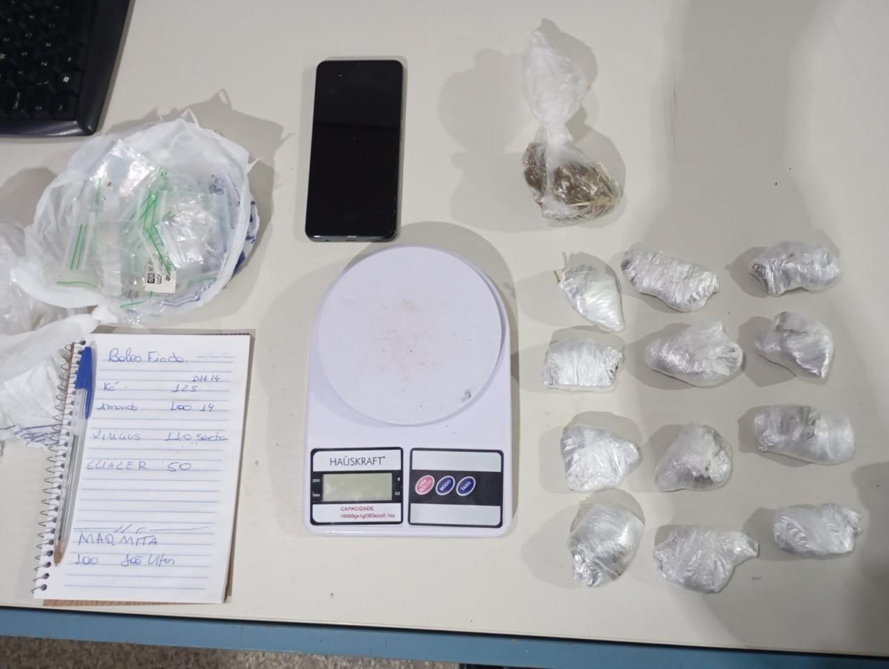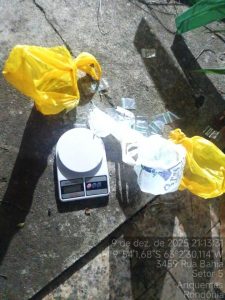 Durante a intervenção, o próprio abordado indicou o local onde a droga estava escondida. Na busca minuciosa, a guarnição localizou substância entorpecente do tipo maconha (variedade skank), fracionada e pronta para a comercialização, além de porção ainda não dividida. No imóvel e em sua área externa, os policiais também apreenderam balança de precisão, embalagens plásticas, anotações relacionadas à venda de drogas e outros apetrechos, elementos que reforçaram a materialidade do crime de tráfico de drogas.