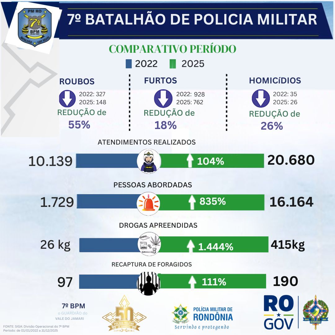 O 7º Batalhão da Polícia Militar de Rondônia apresenta o comparativo dos principais indicadores operacionais entre os anos de 2022 e 2025, evidenciando a ampliação das ações de policiamento ostensivo e preventivo em Ariquemes e todo Vale do Jamari. Os atendimentos registrados apresentaram crescimento contínuo no período, passando de 10.139 em 2022 para 20.680 em 2025, o que representa aumento maior presença policial e capacidade de resposta às demandas da população.