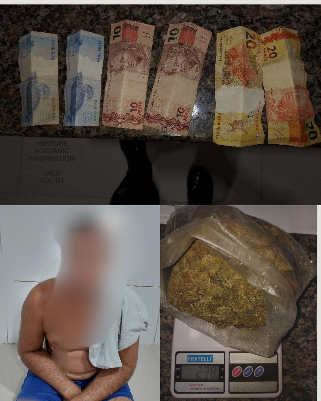 No local, os policiais encontraram uma mochila contendo substância entorpecente análoga à maconha, com peso aproximado de 238 gramas, além de uma balança de precisão e materiais utilizados para o acondicionamento da droga. Também foram apreendidos uma pequena quantia em dinheiro, um caderno com anotações, um aparelho de som portátil sem comprovação de procedência e um telefone celular, conforme previsto na decisão judicial.