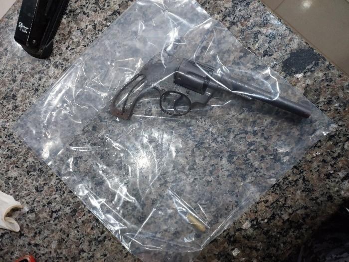 Em continuidade à diligência, e considerando a suspeita de arma de fogo, a equipe realizou varredura em um imóvel vizinho, com acesso direto à residência. No local, foi localizada uma arma de fogo do tipo revólver, calibre 38, municiada, a qual havia sido arremessada para o quintal adjacente, conforme relato da moradora.