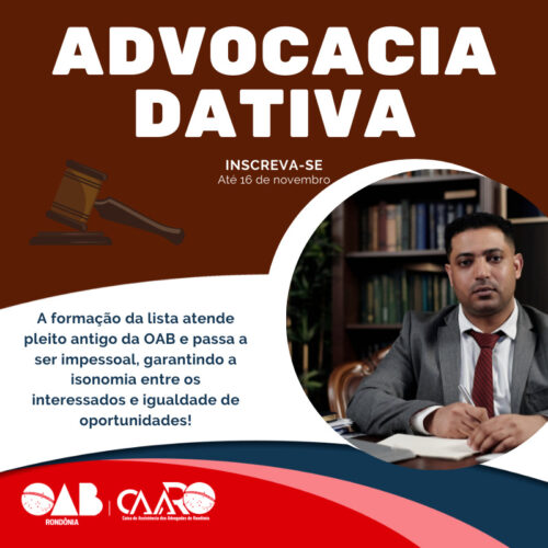 O prazo para inscrição no edital de chamamento para advocacia dativa rondoniense encerra na próxima terça-feira (16). Publicado no último dia 1º de novembro pela Ordem dos Advogados do Brasil – Seccional Rondônia (OABRO), o edital nº 01/2021 tem o objetivo de formar uma listagem de advogados para exercerem a