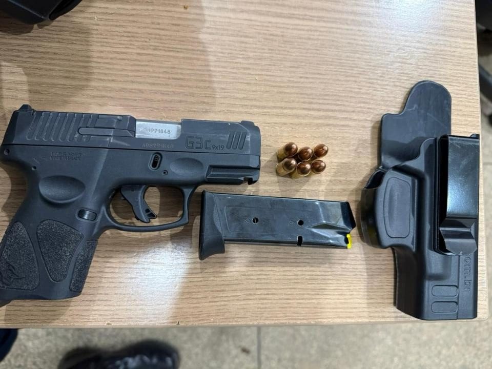 Com apoio de mais uma equipe policial, o suspeito foi localizado em outro ponto da cidade. Na abordagem e busca veicular, os policiais encontraram: