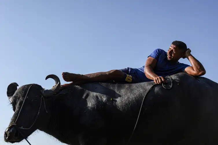 Celular? Videogame? Brinquedos eletrônicos? Em uma das áreas alagadas no município de Soure, na Ilha de Marajó, crianças se divertem nadando com búfalos. Elas têm a missão de adestrar os animais, mas o trabalho vira um detalhe entre saltos e mergulhos, que ajudam a amenizar o calor intenso da região.